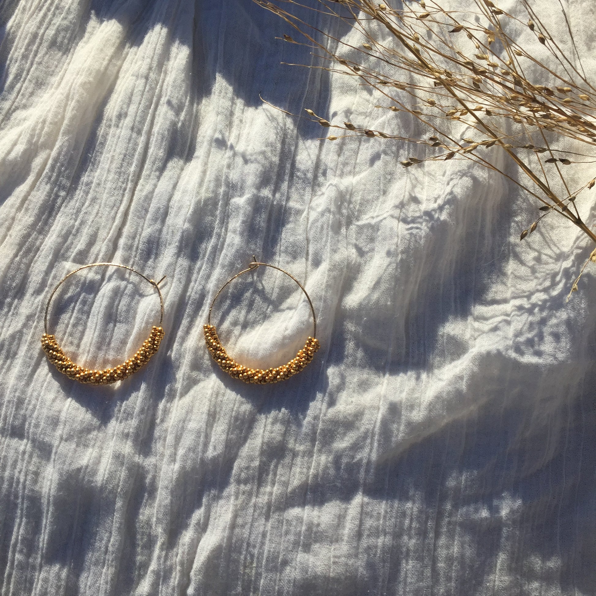 Rae Hoops are a perfect balance of texture and shine. An easy to wear staple that can be dressed up or down. Hand hammered 14k gold filled hoops measure 1.5" across.