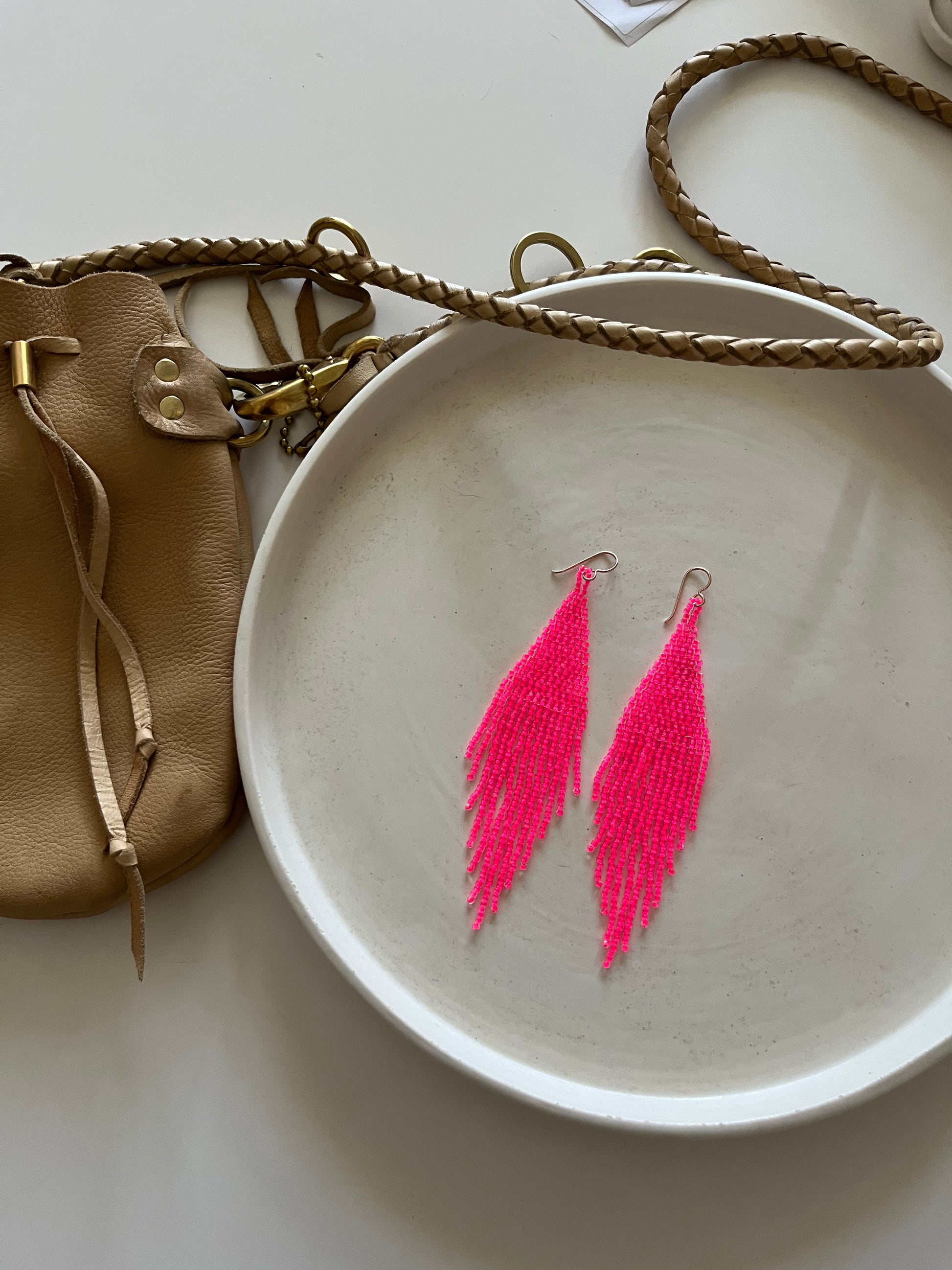 These beads are luminous! The longer tapered fringe version grazes the collarbone, while the shorter straight edge Flamingo has a simple, minimalistic shape that lets the bright neon pink color speak for itself. So much fun packed into such tiny little beads!