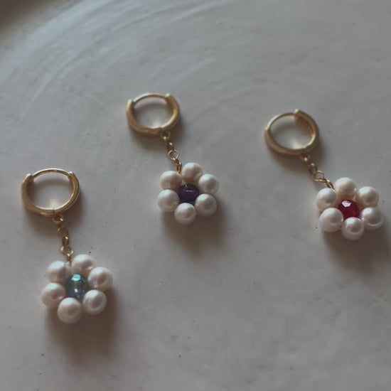 These fun flower drops feature freshwater pearls with a luminous vintage crystal centre, daintily hung from a 14k gold filled hoop.