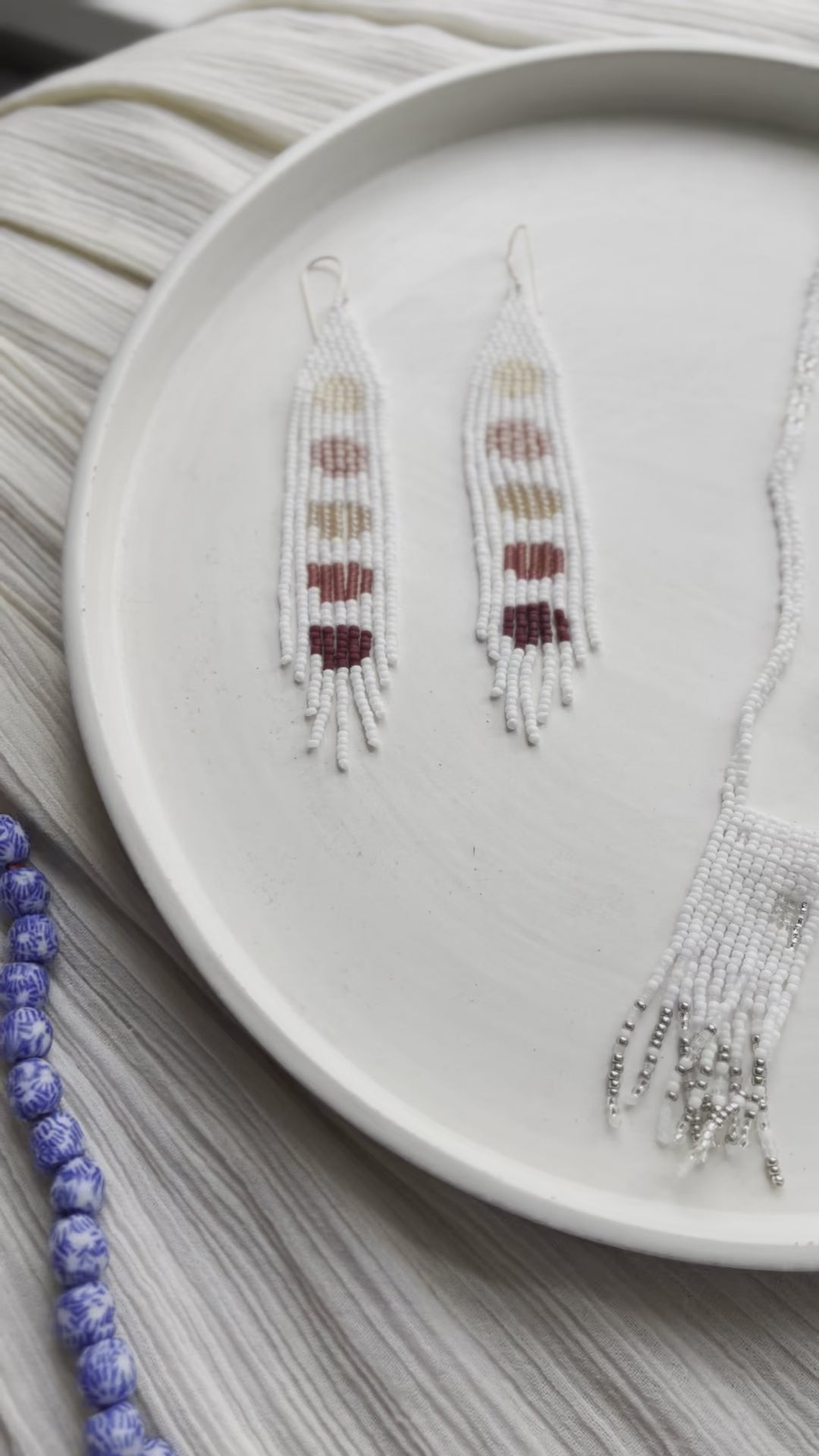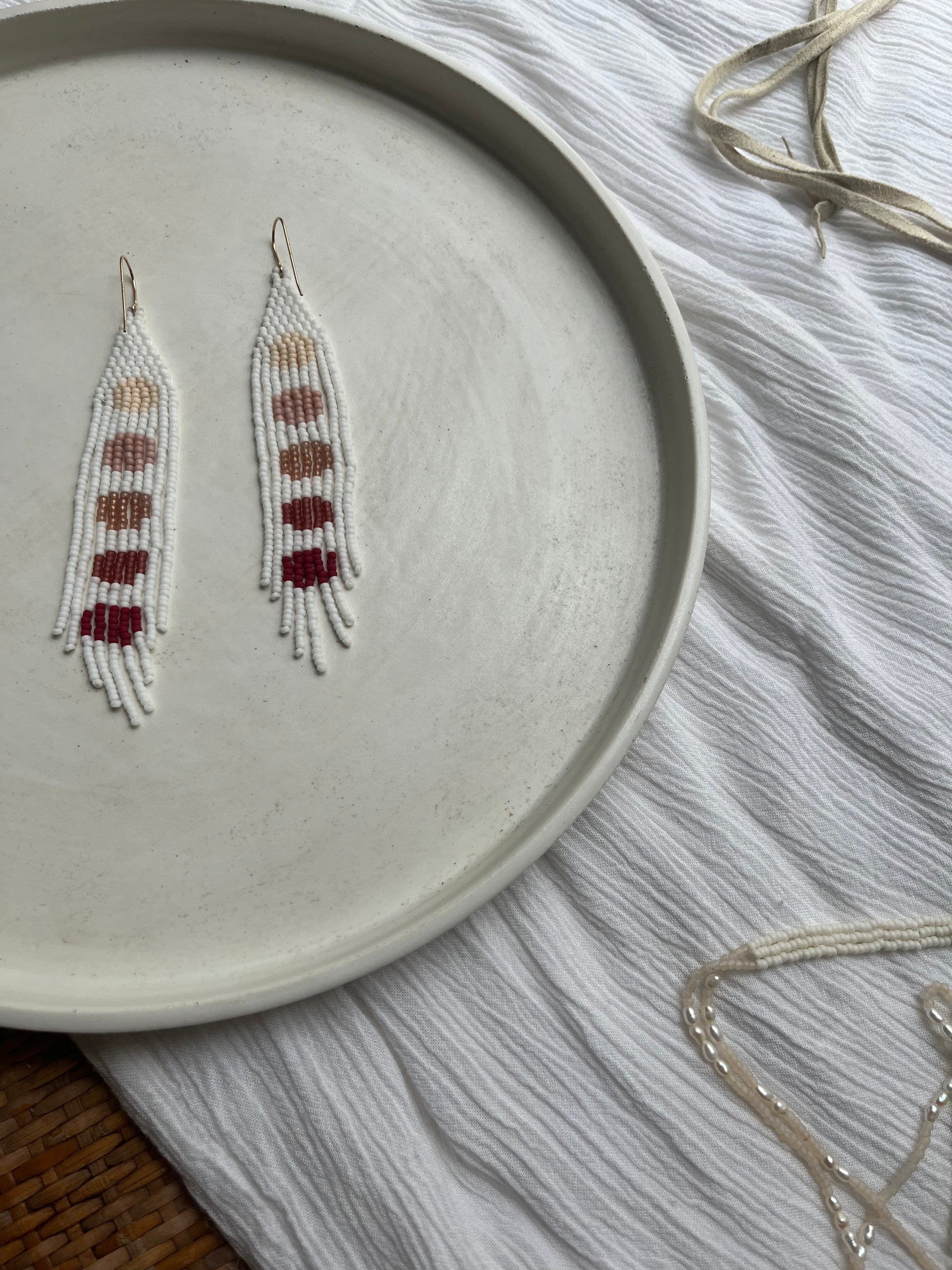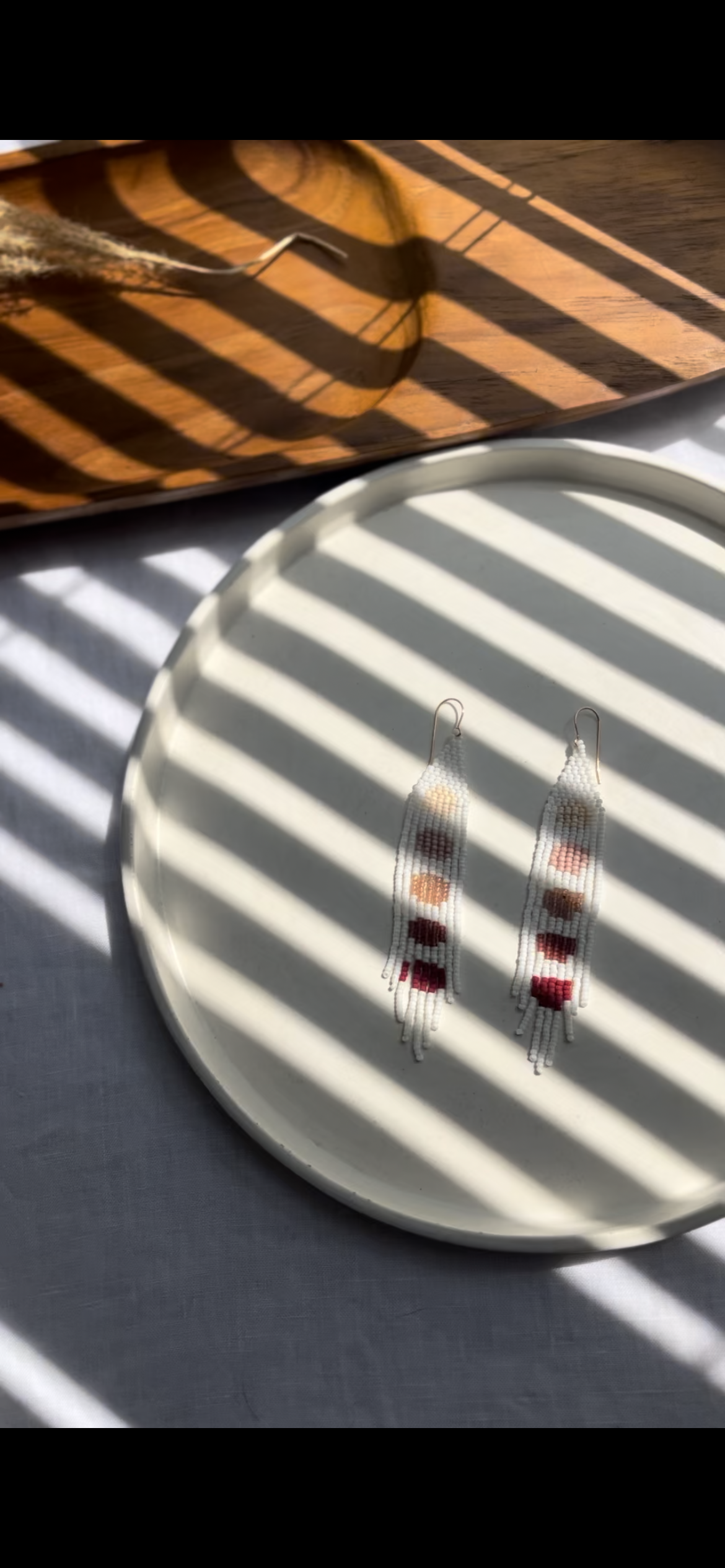 Like the rising of a new day, the Phoenix earring features a gradient of maroon to dark cream on a chalk white base. These beads have an exceptionally beautiful, luxurious feel to them.