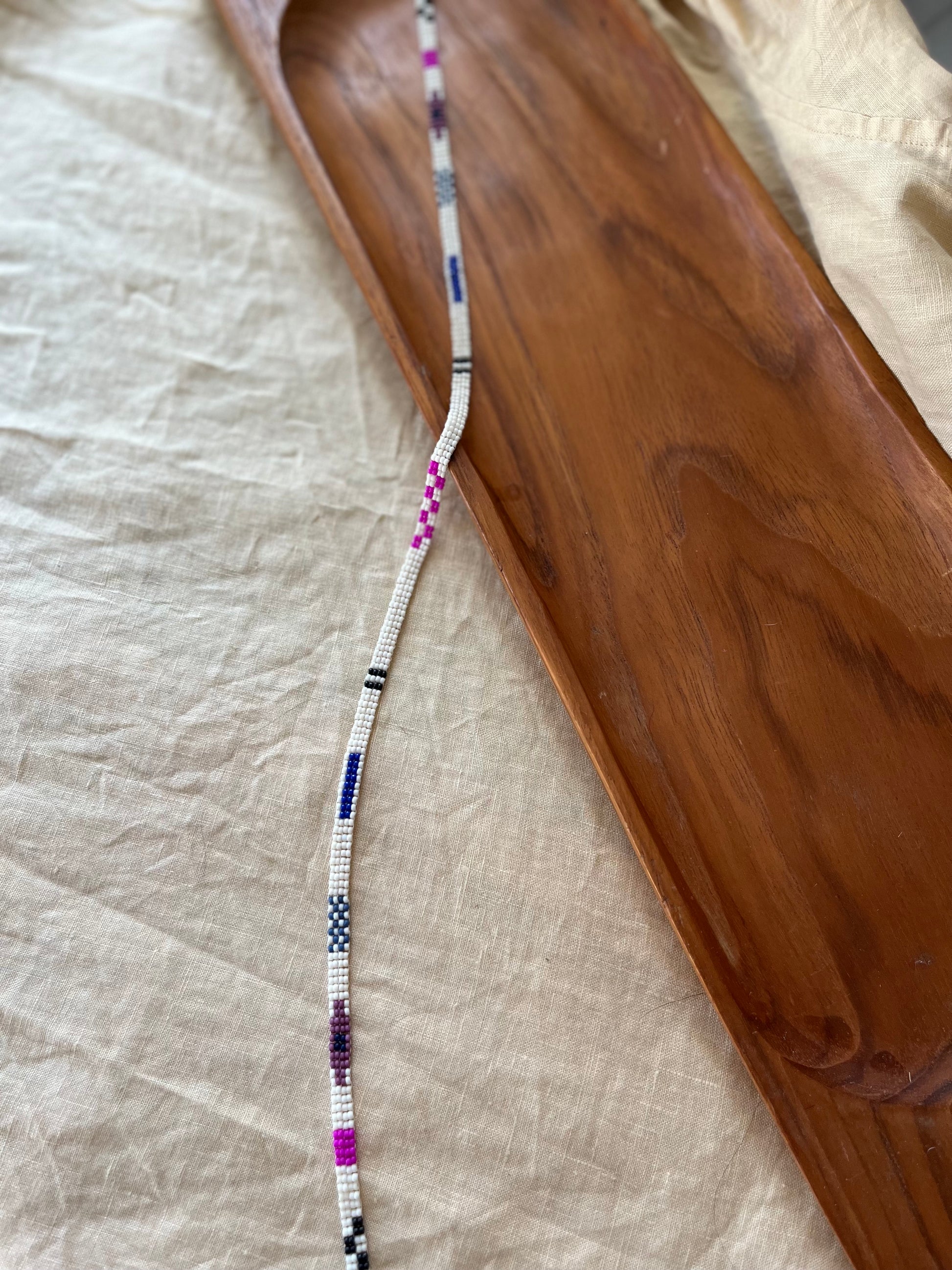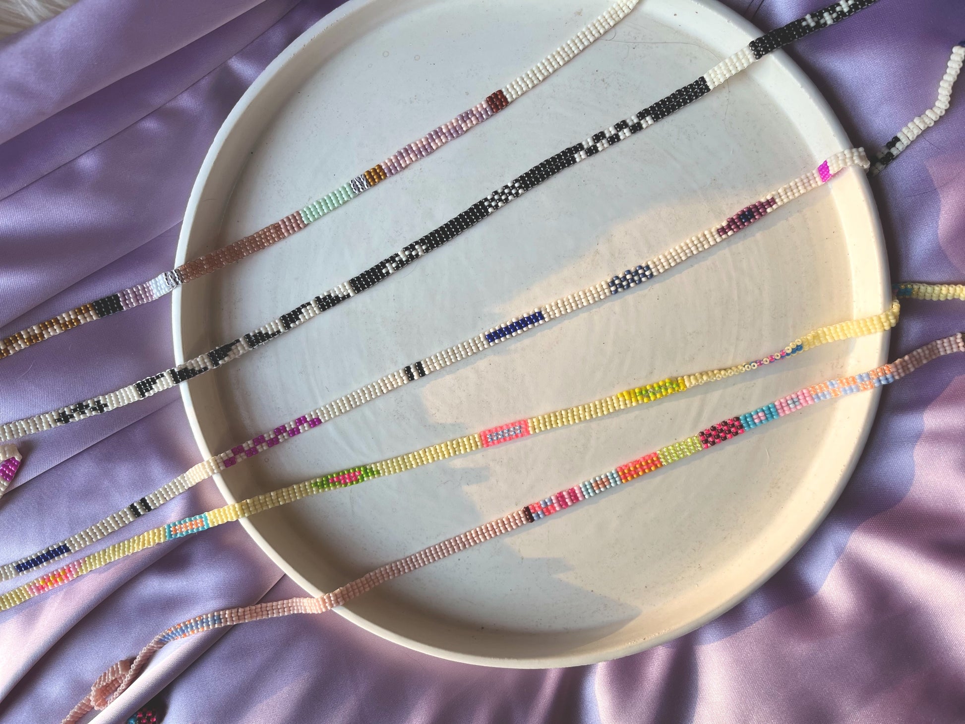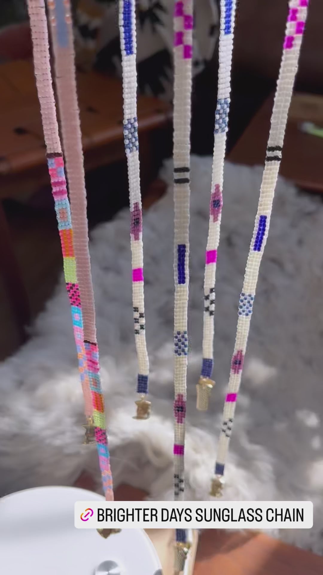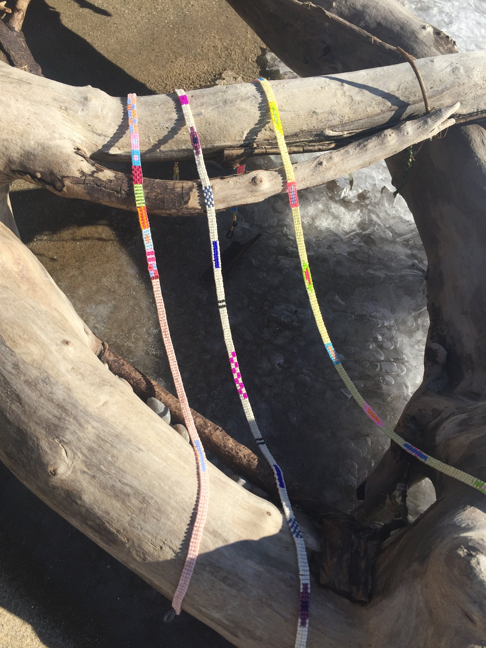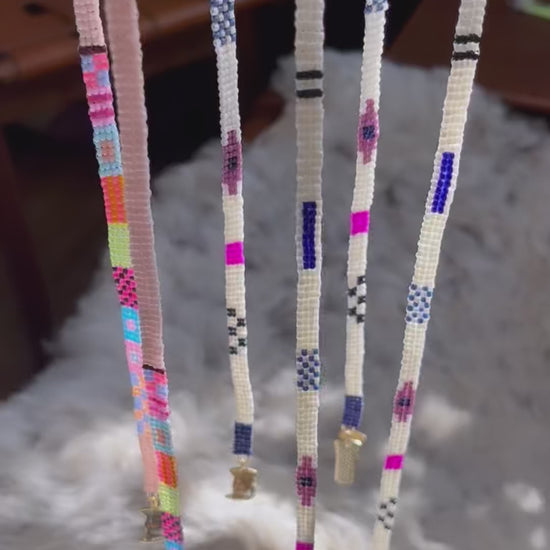 Fashion meets function with these beaded Sunglass chains. Lightweight Japanese glass seed beads are woven together using needle and thread to form dreamy geometric ribbons of color.
