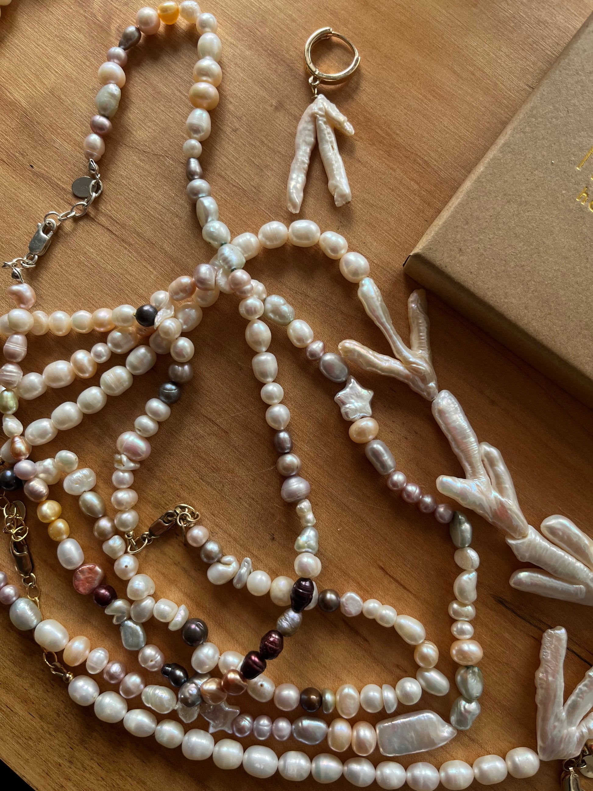 The opal necklace is a true stunner. Baroque freshwater “chicken foot” pearls take center stage on a strand of 8mm ivory pearls. Easily dressed up or down this will be your new staple. Finished with 14k gold filled clasp