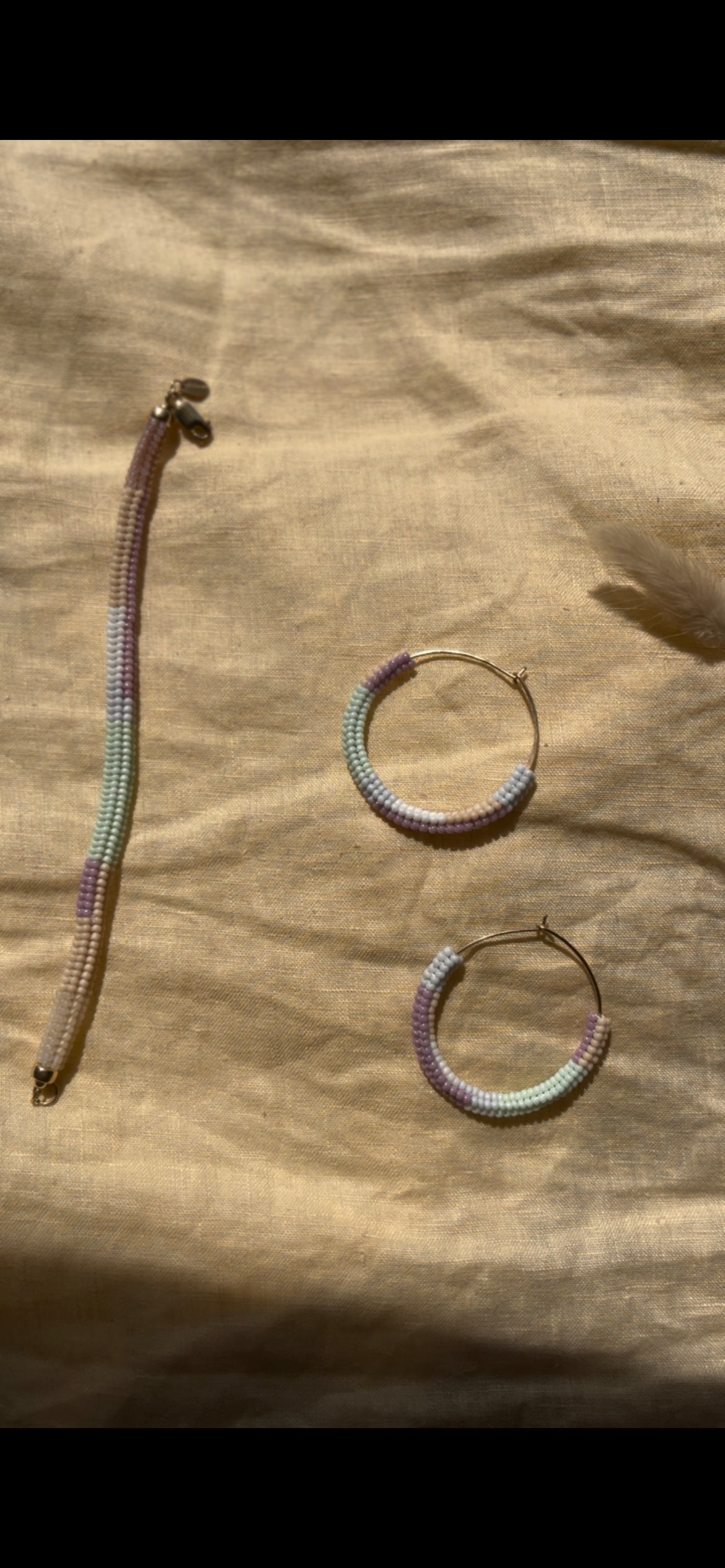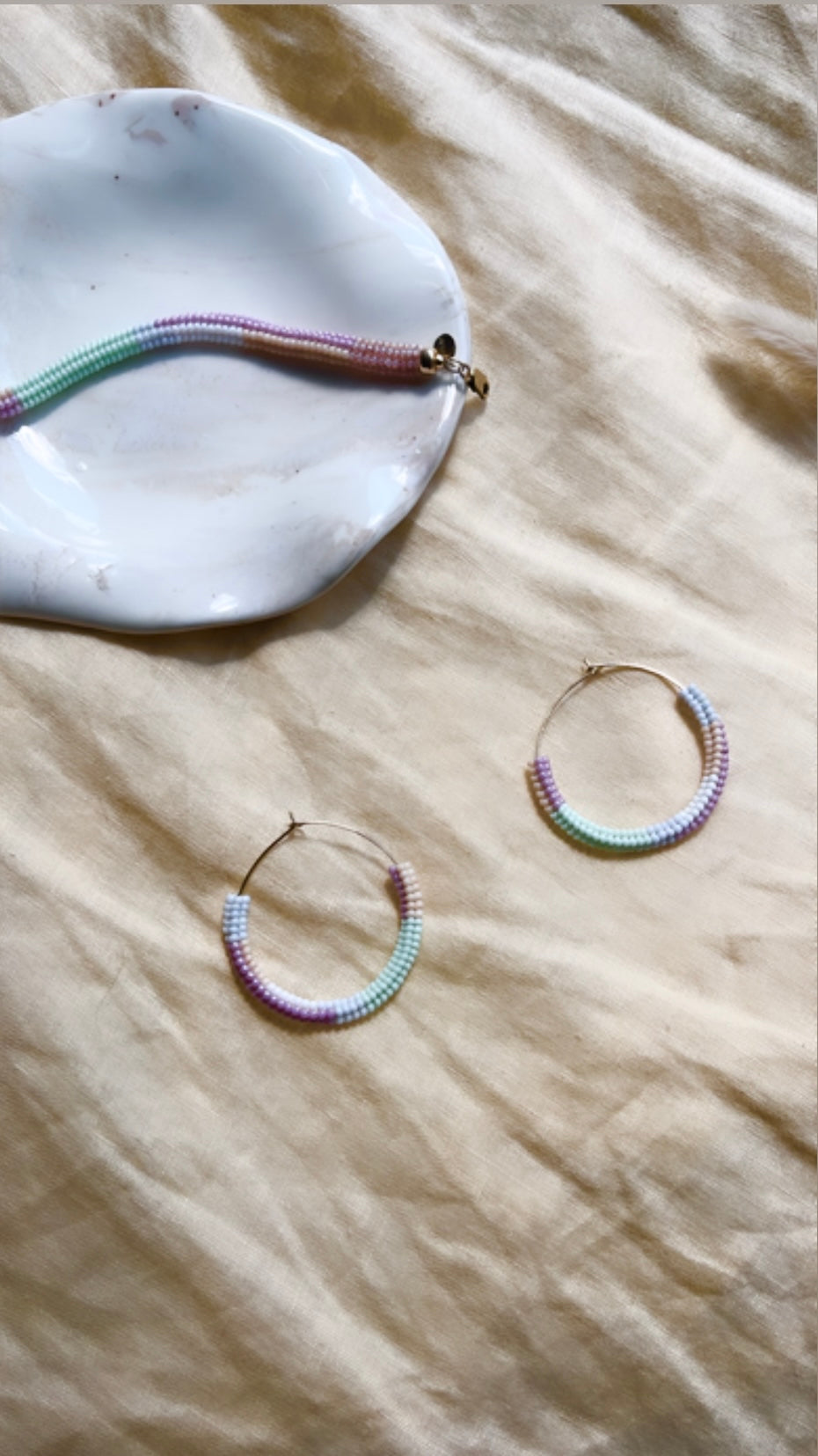 3” hand hammered 14k gold filled hoops with lightweight Japanese glass beads