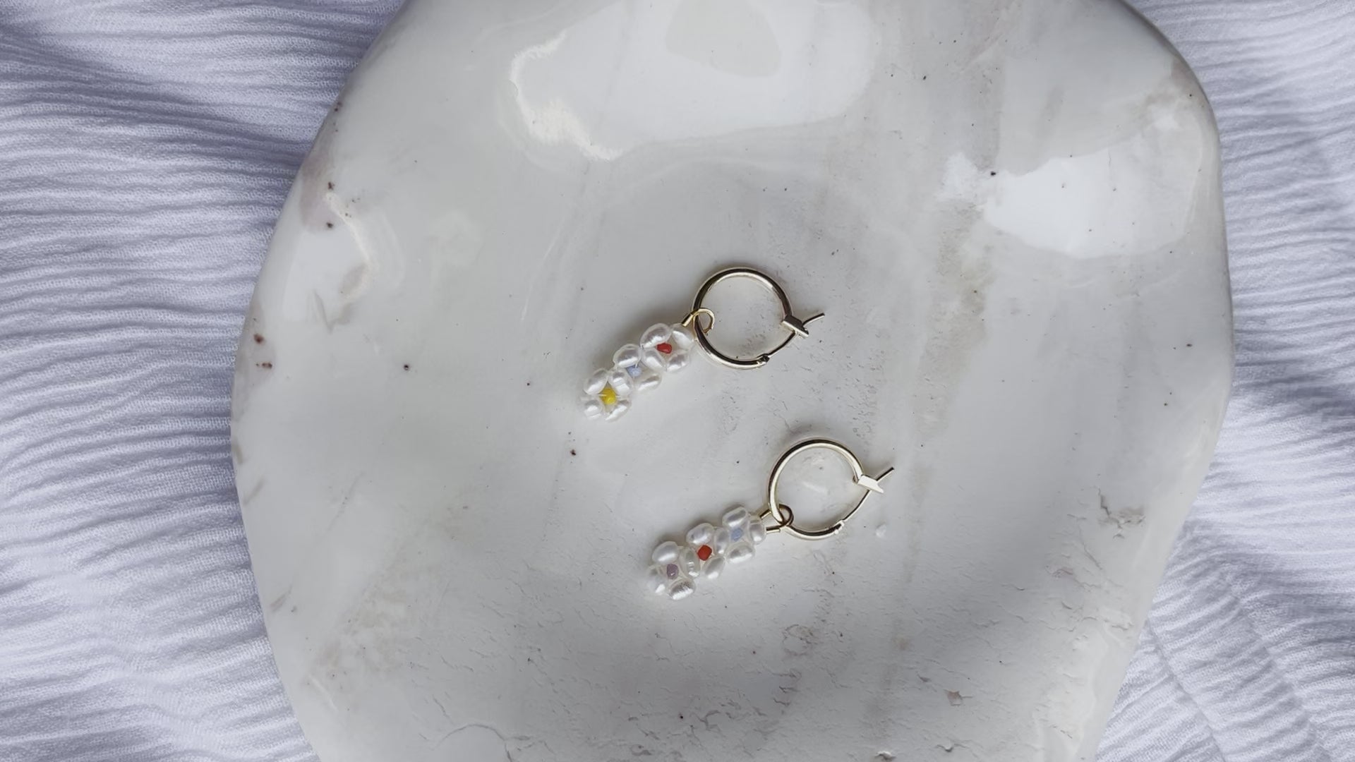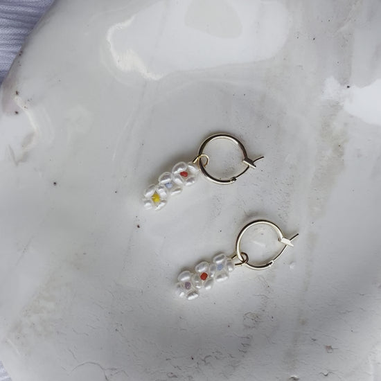 The sweetest little freshwater rice pearl frames are accented with bright pops of color and hang from lightweight 14k gold filled hoops.