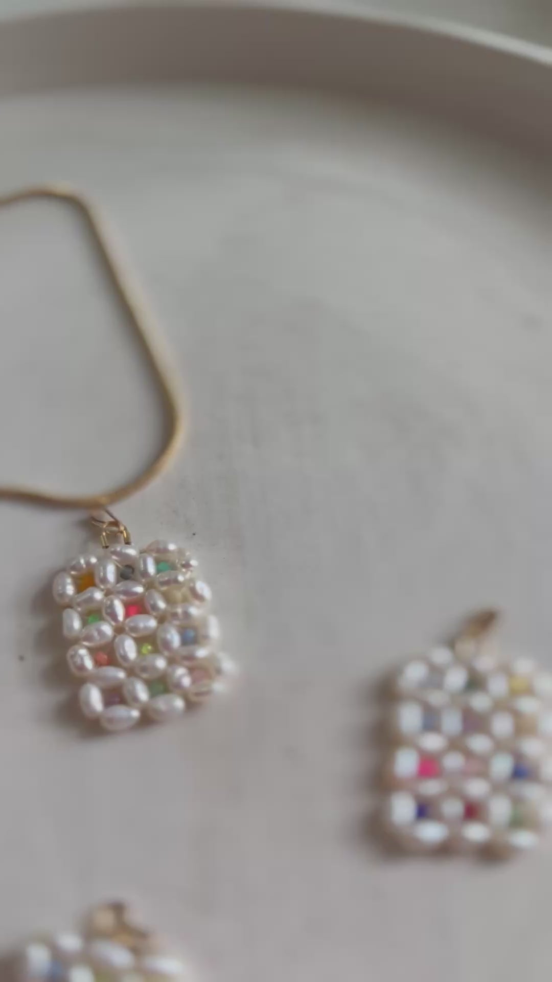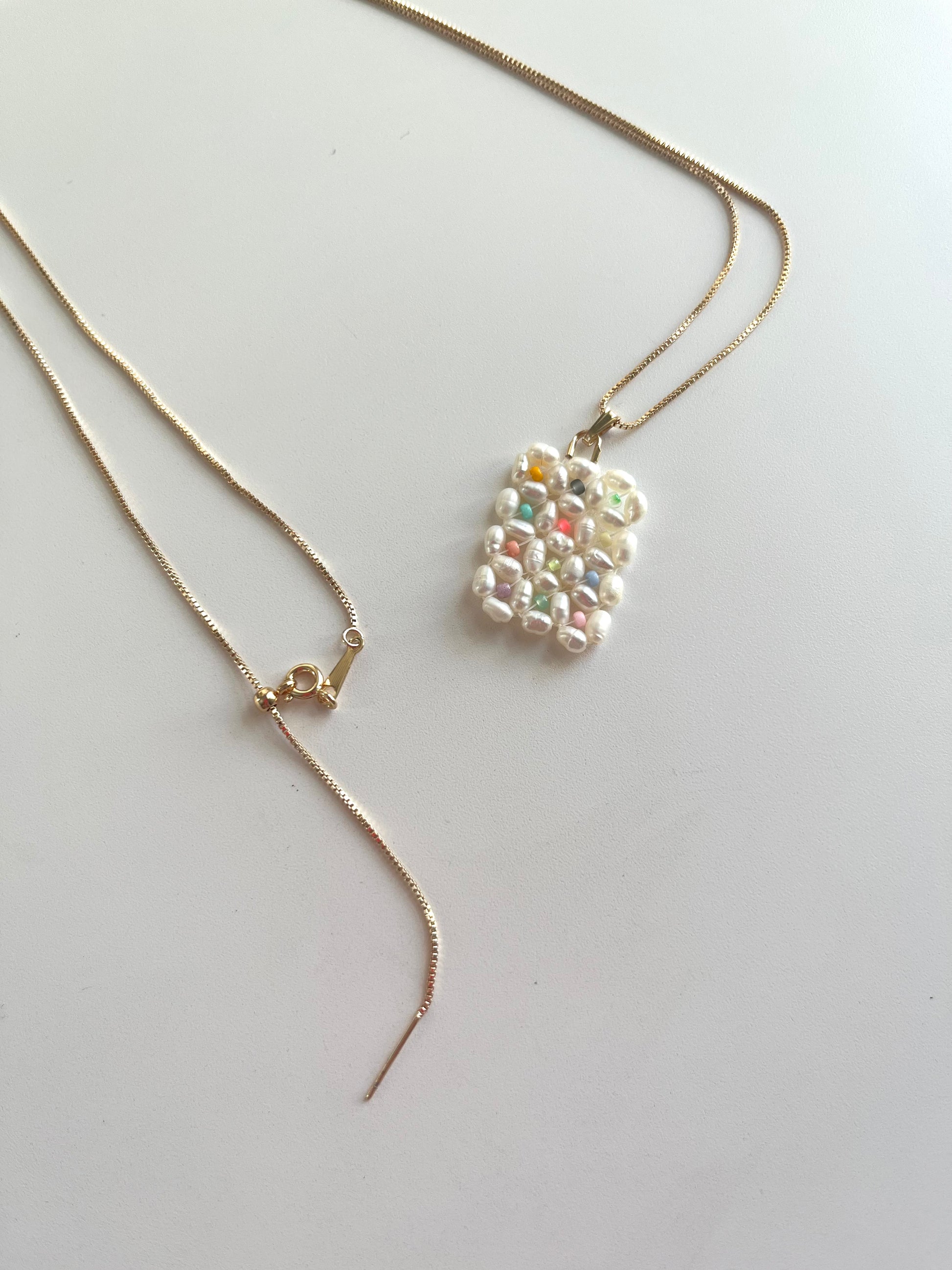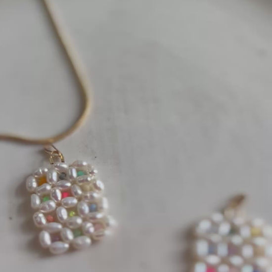 Freshwater pearls are stitched together to create a grid filled with brightly colored Japanese glass seed beads. The pendant comes strung on a handy adjustable length 14k gold filled chain which can be set as a choker or as long as 21” (falling between breastbone). Matching pane hoops are also available to complete the set.